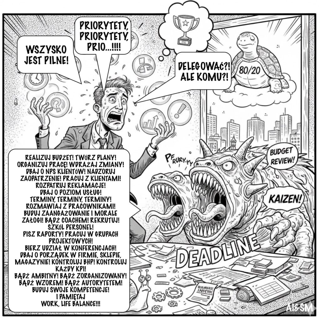 Znawcy tematu zapytają: a co z ustalaniem priorytetów? To przecież kluczowa kompetencja (nie tylko) managera! Odpowiadam z doświadczenia: w korporacji wszystko jest priorytetem. No i zawsze pozostaje kwestia, „dla kogo ten wywiad”? Cele długoterminowe krzyżują się krótkoterminowymi, zależność pionowa, z poziomą, zszargana wiarygodność w ocenie załogi, współpracowników, zarzucenie ich zadaniami i ciagła zmienność celów w starciu z koniecznością budowania ich motywacji, dowożenie wszystkich celów dla szefa bezpośredniego, niebezpośredniego etc. Przebodźcowanie!