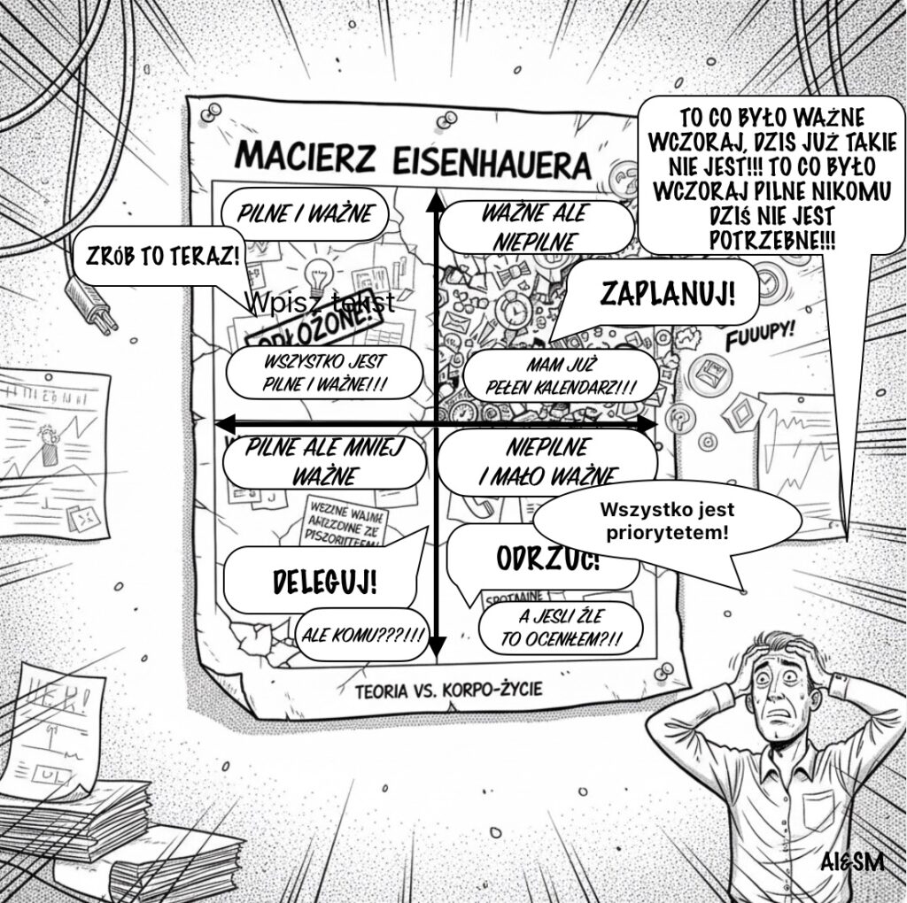 Na rysunku poniżej przedstawiam Macierz Eisenhowera. Znamy ją wszyscy. Problem pojawia się, gdy próbujemy poukładać zadania zgodnie z klasyfikacją. Najczęściej mylimy to co „pilne” i ma swój deadline, z tym, co „ważne”, czyli niosącym istotną wartość biznesową. W korporacji e-mail od przełożonego, raport i kolejna tabelka dla szefa zwykle wygrywa z rozmową o rozwoju z pracownikami, co rodzi naszą frustrację. Planowanie jest ekwilibrystyką, gdy kalendarz wypełniony jest co do minuty. Niełatwe jest także delegowanie, gdy wiemy z iloma zadaniami już mierzą się nasi podwładni, czyli do wyboru mamy brak realizacji celu, lub wzrastające zbiorowe zniechęcenie. Ryzykowne jest także odrzucenie zadań, które z dzisiejszej perspektywy wydają się nieważne i niepilne. Trzeba dużo doświadczenia w organizacji i „nosa”, aby przewidzieć, co za miesiąc lub dwa stanie się „red allertem”.